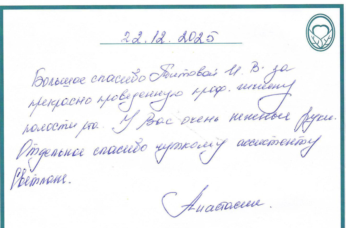 22 декабря 2025 - Большое спасибо Титовой И.В. за прекрасно проведенную проф. гигиену полости рта. У Вас очень нежные руки. Отдельное спасибо чуткому ассистенту Светлане. Анастасия