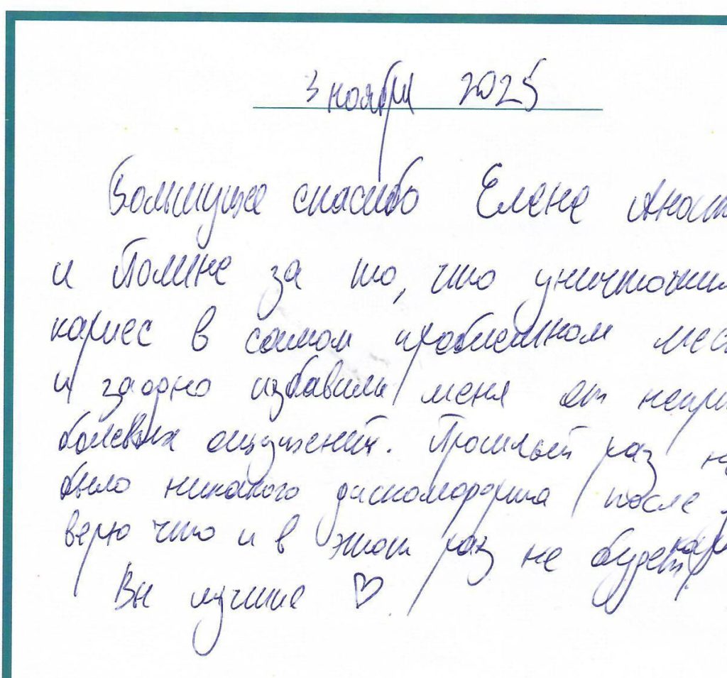 03 ноября 2025 — Большущее спасибо Елене Анатольевне и Полине за то, что уничтожили кариес в самом проблемном месте и заодно избавили меня от неприятных болевых ощущений. Прошлый раз не было никакого дискомфорта (после, верю что и в этот раз не будет).
