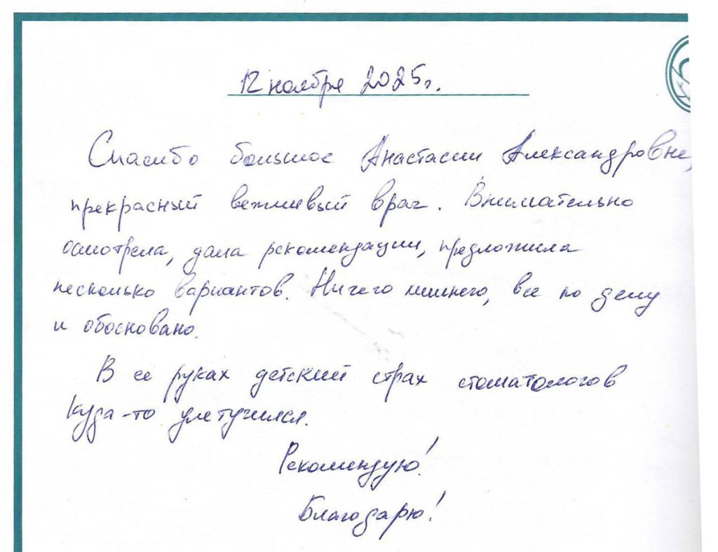 12 декабря 2025 — Спасибо большое Анастасии Александровне, прекрасный вежливый врач. Внимательно осмотрела, дала рекомендации, предложила несколько вариантов. Ничего лишнего, все по делу и обосновано. В ее руках детский страх стоматологов куда-то улетучился. Рекомендую! Благодарю!
