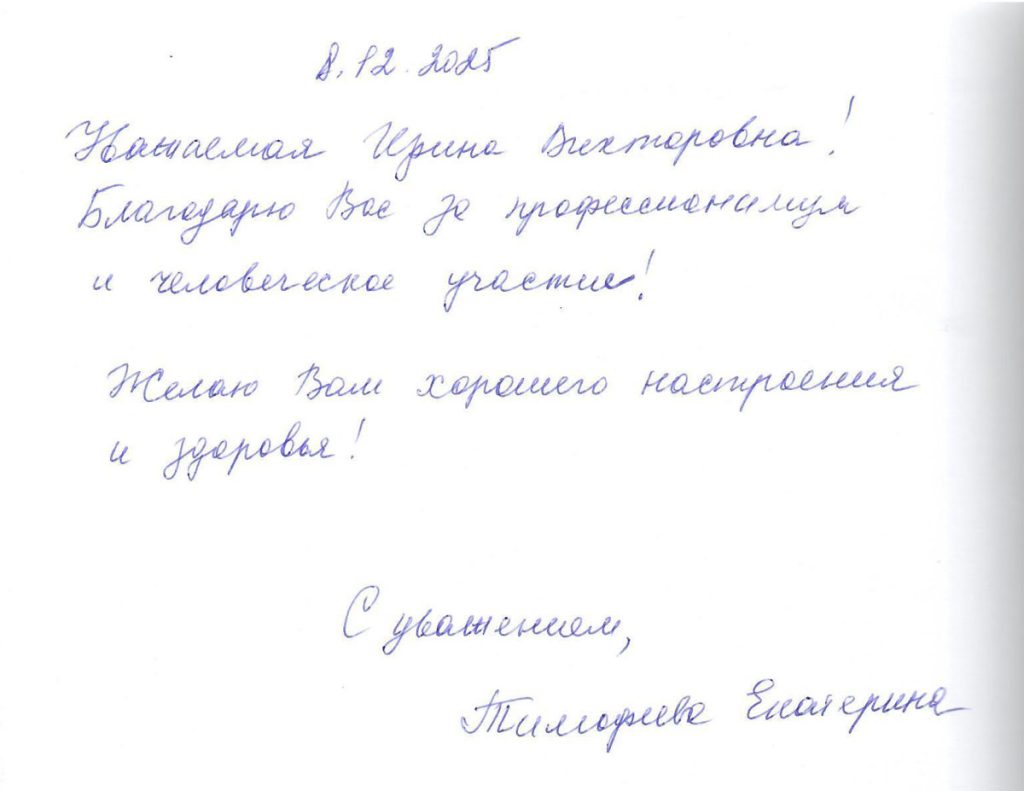 08 декабря 2025 — Уважаемая Ирина Викторовна! Благодарю Вас за профессионализм и человеческое участие! Желаю Вам хорошего настроения и здоровья! С уважением, Тимофеева Екатерина